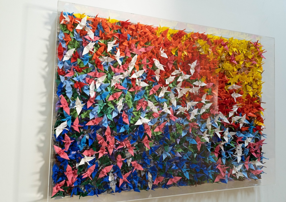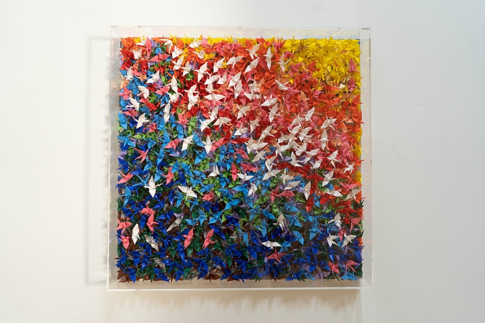 Sen's work features a thousand paper cranes, which represent wishes and hopes, painted on a panel. The cranes are well-balanced and arranged with multiple paints, and are framed in an acrylic case, giving off a unique presence. The work is full of strength and energy, with a pop art-like quality added to modern art.